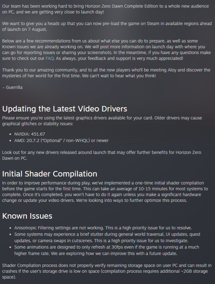 Current status of the game and some info such as shader compilation and that anisotropic filtering is currently non-functional along with some animations being tuned at 30 FPS.