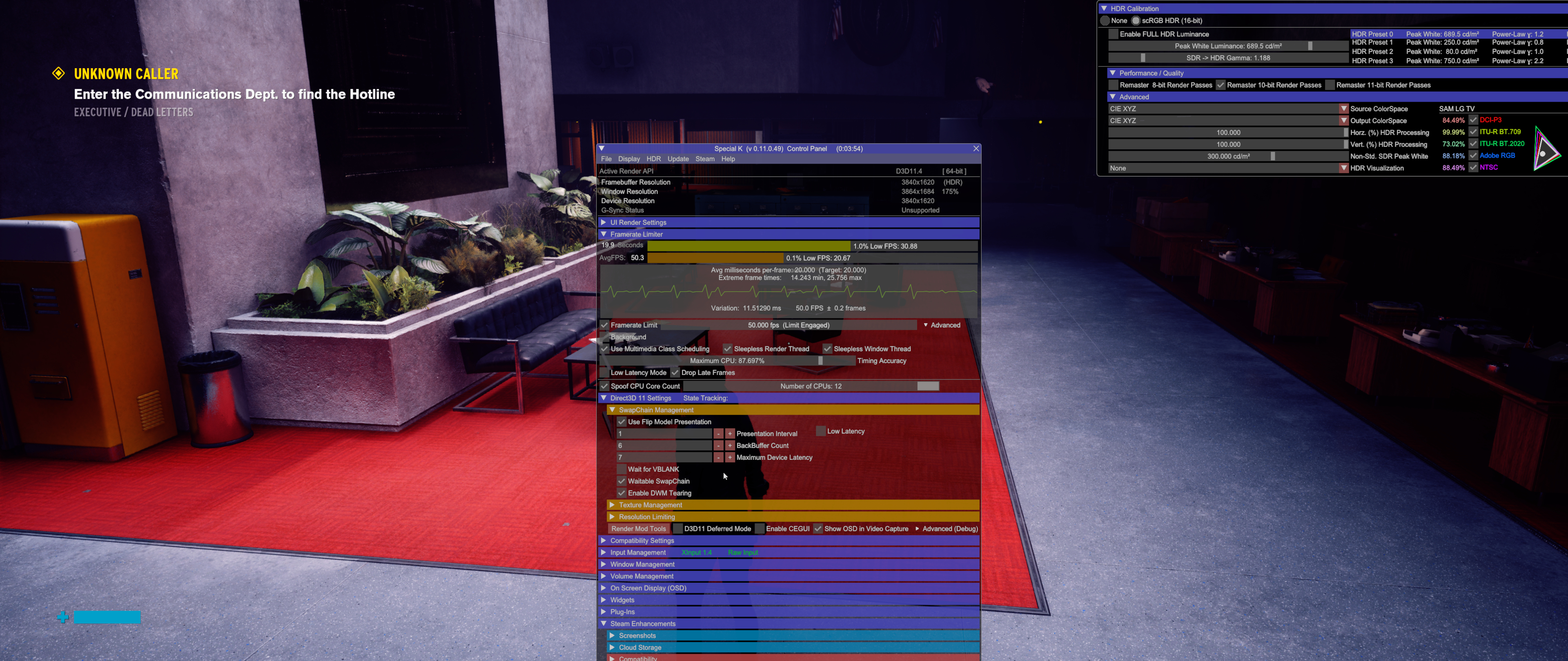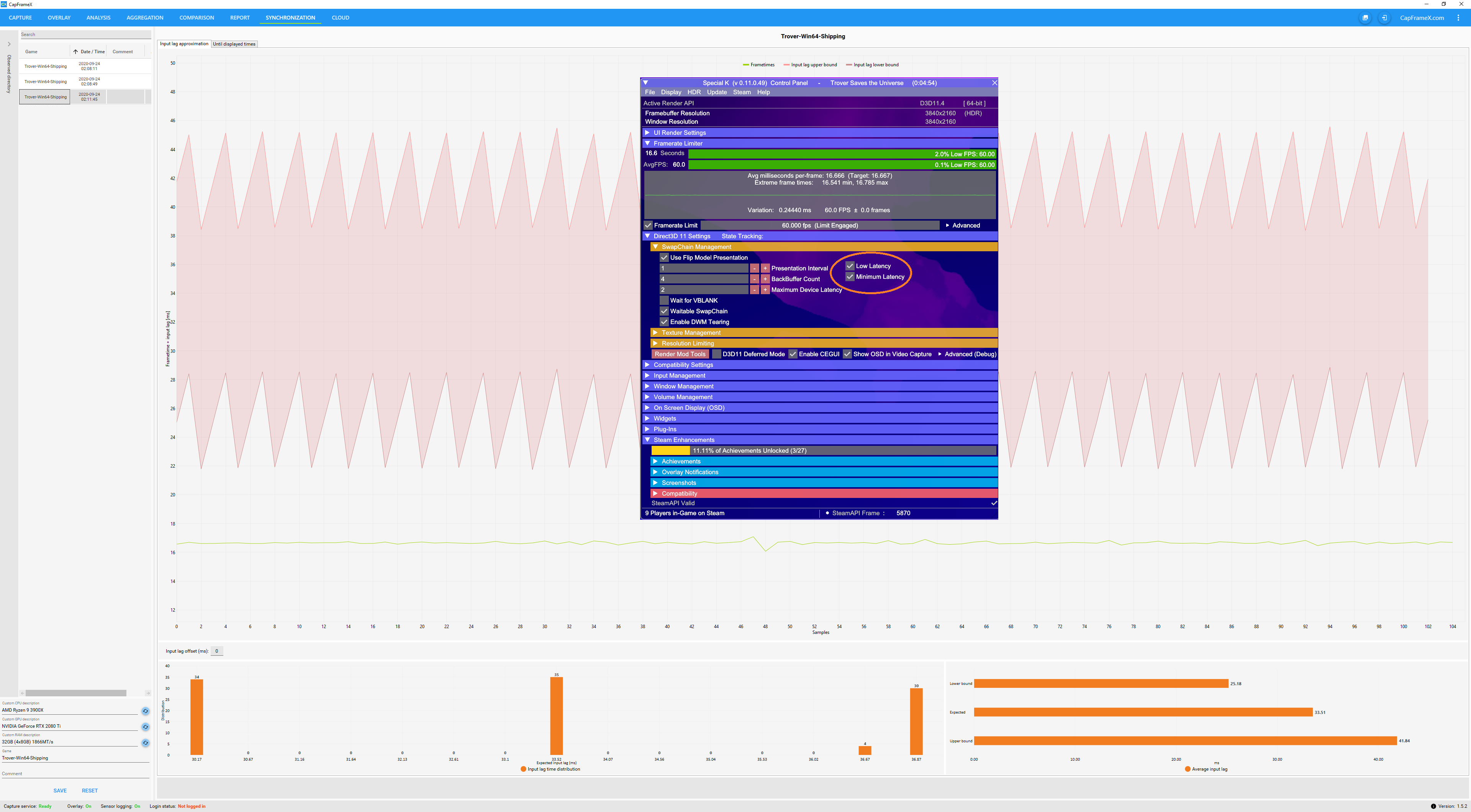 I don’t really know how to describe Special K’s framerate limiter, because on paper, yeah… there should be some kind of trade-off happening when you turn on framerate limiting. In practice, it somehow pulls off latency improvement, frametime consistency improvement, hitch elimination and reduced CPU load at the same time.